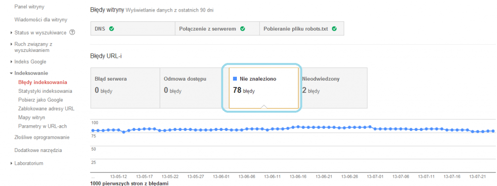 Sometimes, despite careful preparation of the 301 redirection list, omissions occur and 404 error pages appear in the new version of the website. In the case of large websites that have many backlinks, a situation may arise in which the links they direct you to such sites. Without taking action on our part, we lose some links and thus may have lower positions in the search engine for some keywords. Then it becomes important to track the errors that Google robots encounter when visiting our website. To do this, you should use Google Webmaster Tools (Indexation -> Indexing errors -> Not found), which I wrote about some time ago on our blog, in this article.