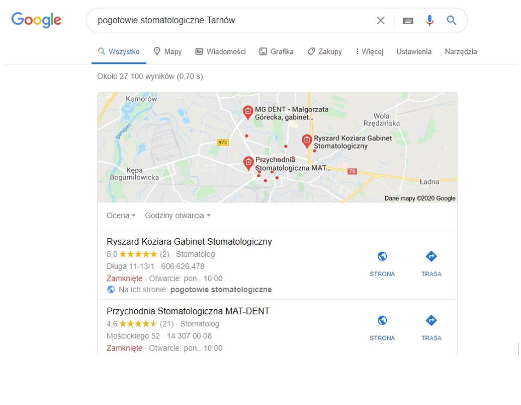 Secondly, when creating content, remember to include phrases related to the location, e.g. "dentysta Łódź", "pogotowie stomatologiczne Tarn".