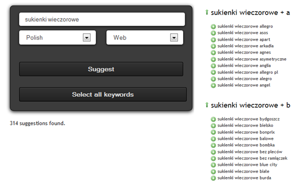The next tool on our list is the ubersuggest.org service, which is able to search for hundreds of keyword suggestions resulting from combining our main phrase with words starting with all letters of the alphabet. Of course, we should always remember to check the popularity of searched phrases in Kewyord Planner.