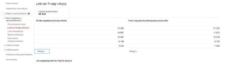 Twoim pierwszym zadaniem będzie przygotowanie listy adresów URL stron, na których znajdują się linki kierujące do Twojego serwisu. Według pracowników Google w tym celu powinny wystarczyć Ci dane, które znaleźć można w Narzędziach Google dla Webmasterów. Aby je pobrać udaj się do zakładki Ruch związany z wyszukiwaniem -> Linki do Twojej witryny. Następnie w sekcji Źródła największej liczby linków klikamy Więcej.