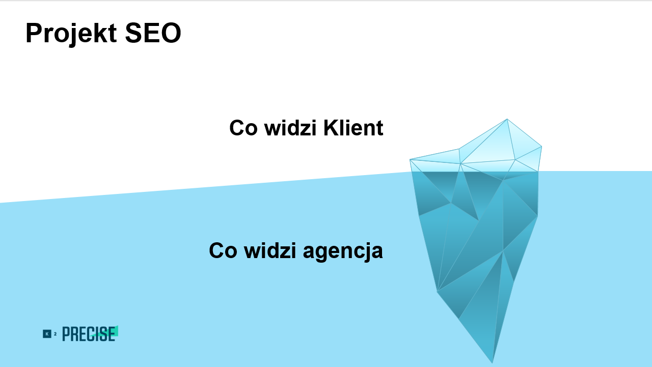 Na początek chciałbym zaznaczyć, że wyobrażenie klienta o projekcie SEO różni się od tego, jaką perspektywę przyjmuje agencja. Zazwyczaj to, co widzi klient, jest tylko czubkiem góry lodowej. W efekcie działania SEO czasami są postrzegane jako działania mniej transparentne niż działania płatne (np. SEM). SEO to dla wielu klientów wręcz „czarna magia”, choć w rzeczywistości to ciężka praca wielu specjalistów, m.in. specjalistów SEO czy content writerów tworzących treści.