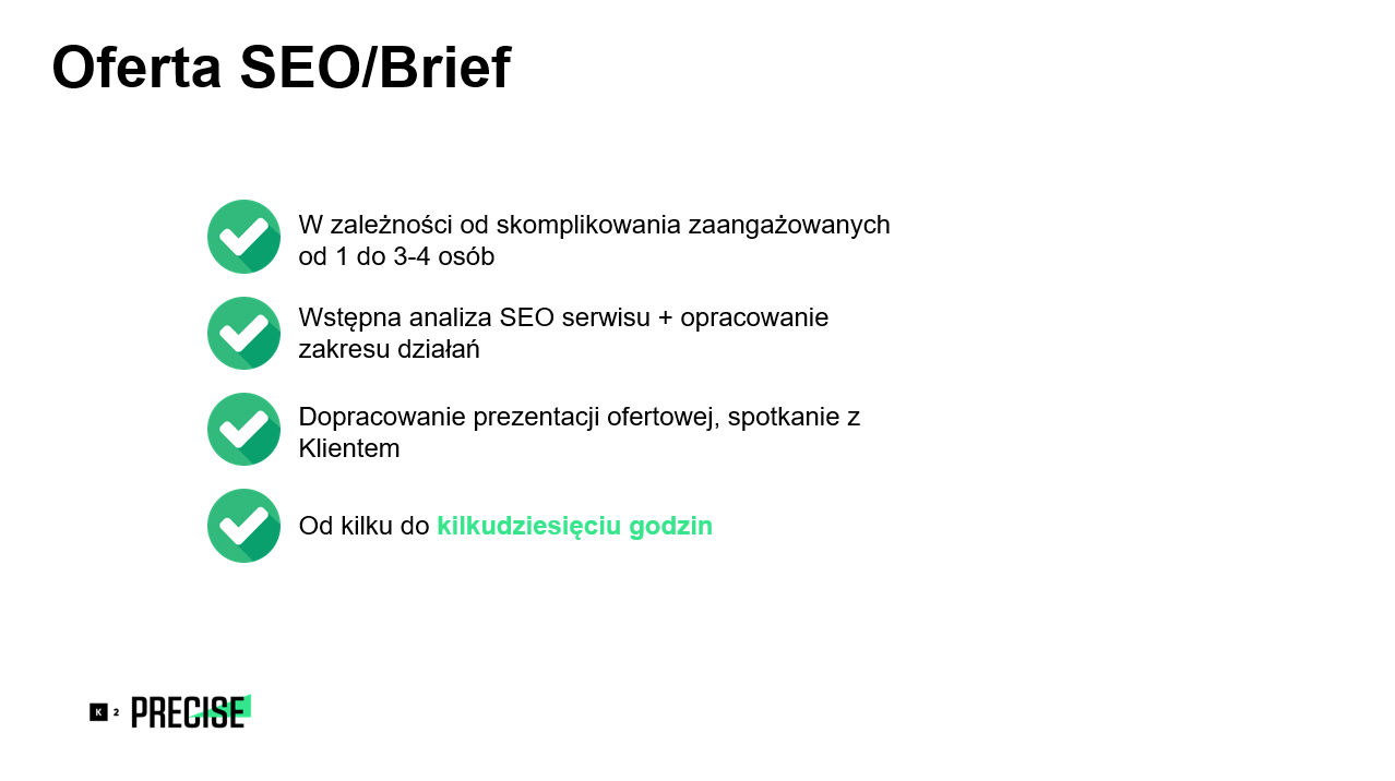 Z perspektywy klienta praca ogranicza się często tylko do tych czterech działań. W rzeczywistości wszystko zaczyna się o wiele wcześniej. Dla agencji projekt SEO zaczyna się w momencie, w którym przychodzi do niej klient (zaprasza do przetargu, wysyła brief itp.). Należy przy tym pamiętać, że dobrze przygotowany brief to ogromne ułatwienie zarówno dla agencji, jak i dla klienta.