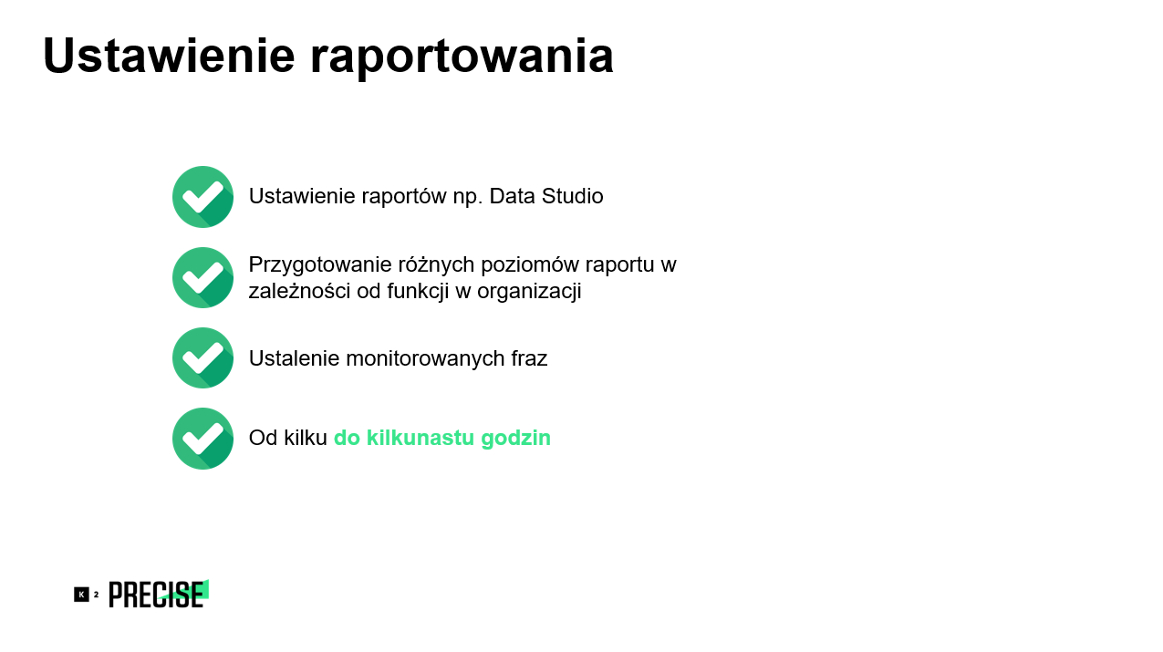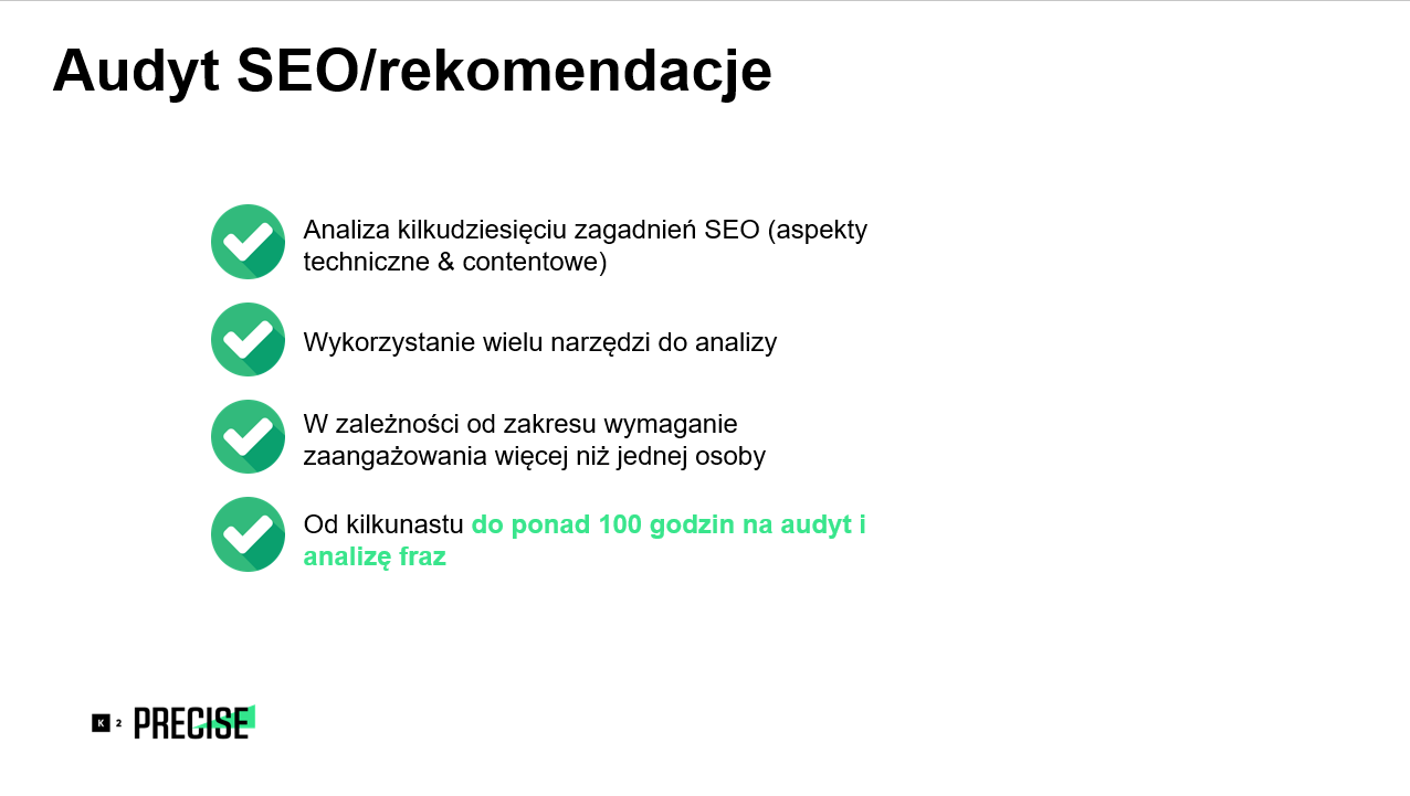 Audyt polega na analizie kilkudziesięciu zagadnień SEO (zarówno od strony technicznej, jak i contentowej) mających wpływ na technikalia i treść w serwisie. Specjaliści SEO korzystają przy tym z wielu narzędzi do analizy, które pozwalają na wyciągnięcie informacji i wniosków. Audyt wraz z analizą fraz zajmuje agencji od kilkunastu do ponad 100 godzin. To praca, którą trzeba wykonać na samym początku, aby mogły wystartować kolejne etapy projektu. Kolejnym etapem jest ustawienie raportowania. W tym przypadku ważne jest to, aby przygotować różne poziomy raportów w zależności od funkcji danej osoby w organizacji. Ustala się także zakres fraz monitorowanych. Ten etap działania zajmuje agencji od kilku do kilkunastu godzin.