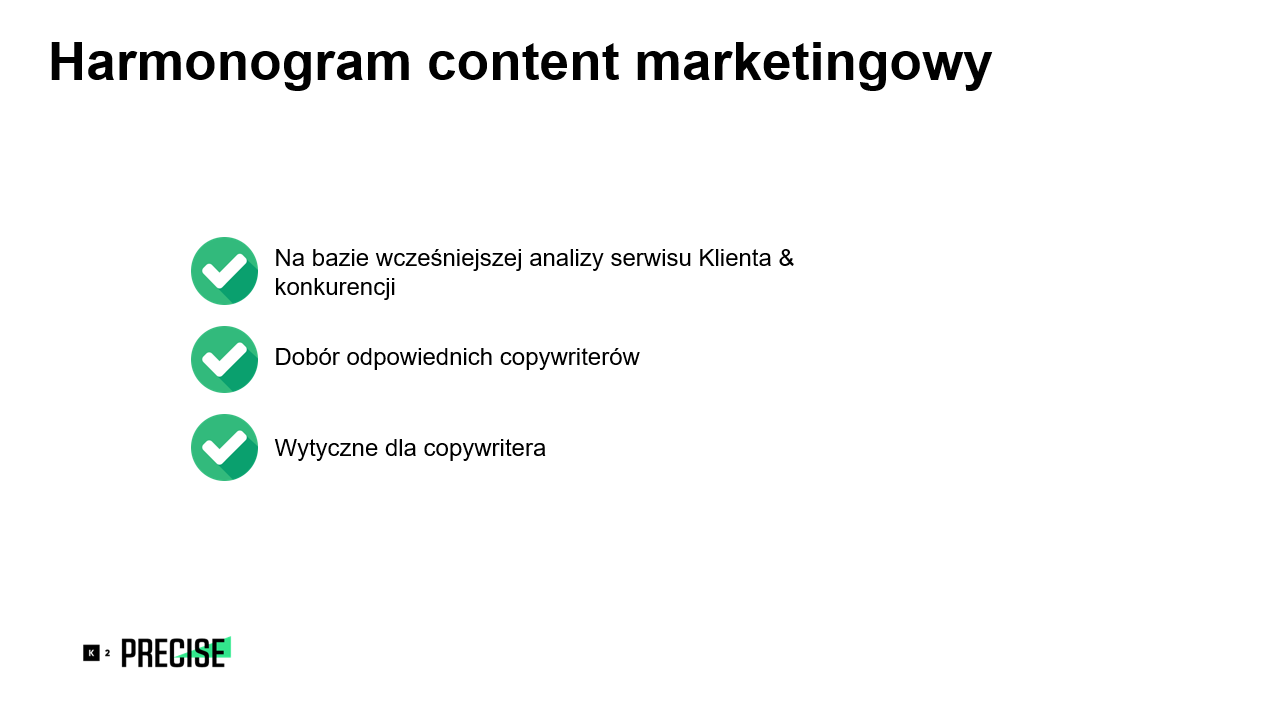 Po wykonaniu wcześniejszych zadań agencja przechodzi do ustalenia harmonogramu działań content marketingowych. Mówi się, że „content is king”, więc należy zacząć od analizy wcześniejszych działań klienta oraz jego konkurencji i wyciągnięcia wniosków, jakie treści najlepiej się sprzedają. Ważny jest także dobór odpowiednich copywriterów i content writerów, którzy są specjalistami w swojej dziedzinie. Na tym etapie tworzy się wytyczne dla osób tworzących treści, zawierające informacje o liczbie tekstów, słowach kluczowych, przydatnych linkach itp.