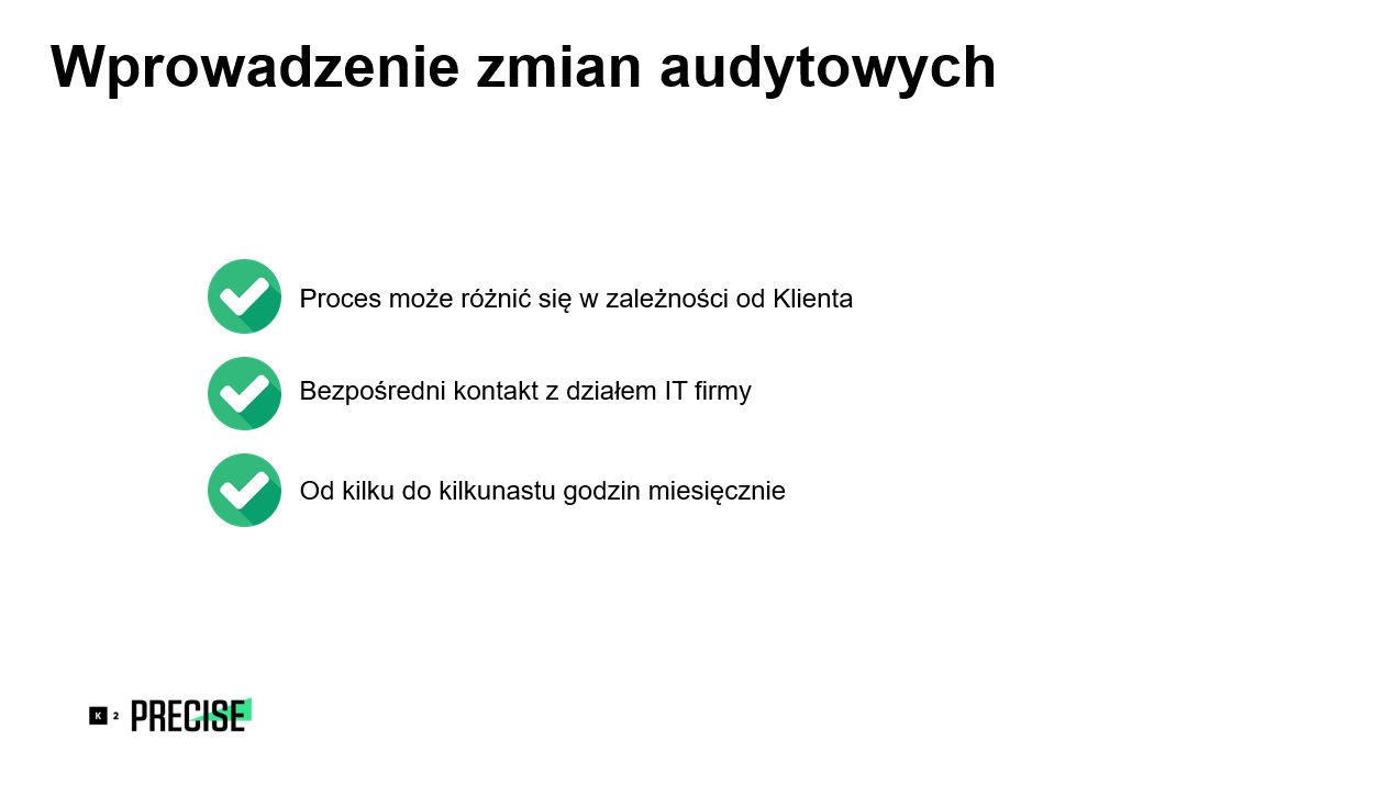 W kolejnych tygodniach i miesiącach działań wprowadzamy zmiany audytowe. Trzeba włożyć odpowiedni wysiłek także w edukację klienta po to, aby działania SEO nie wydawały mu się tylko „czarną magią”, ale żeby rzeczywiście zobaczył w nich ciężką pracę wielu specjalistów. Proces wprowadzania zmian audytowych może różnić się w zależności od klienta – w małych serwisach zmiany wprowadza się szybciej. Ważnym krokiem na tym etapie pracy jest bezpośredni kontakt z działem IT firmy, który potrafi przyspieszyć wiele działań. Etap wprowadzania zmian audytowych to czas od kilku do kilkunastu godzin miesięcznie.