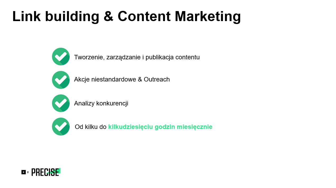Od mniej więcej drugiego miesiąca pracy startują działania z zakresu link building i content marketing. Na ten etap składają się m.in. tworzenie, zarządzanie i publikacja treści. Jest to proces złożony, związany z doborem odpowiednich copywriterów i jak najlepszego contentu. Później przychodzi czas na akcje niestandardowe i outreach, czyli przygotowywanie raportów, promowanie i nawiązywanie relacji w mediach i innych serwisach. Na tym etapie pracy ważna jest też analiza konkurencji po to, aby jeszcze bardziej zoptymalizować działania wykonywane przez naszą agencję dla klienta. Na wszystkie te zadania trzeba poświęcić od kilku do kilkudziesięciu godzin w miesiącu.