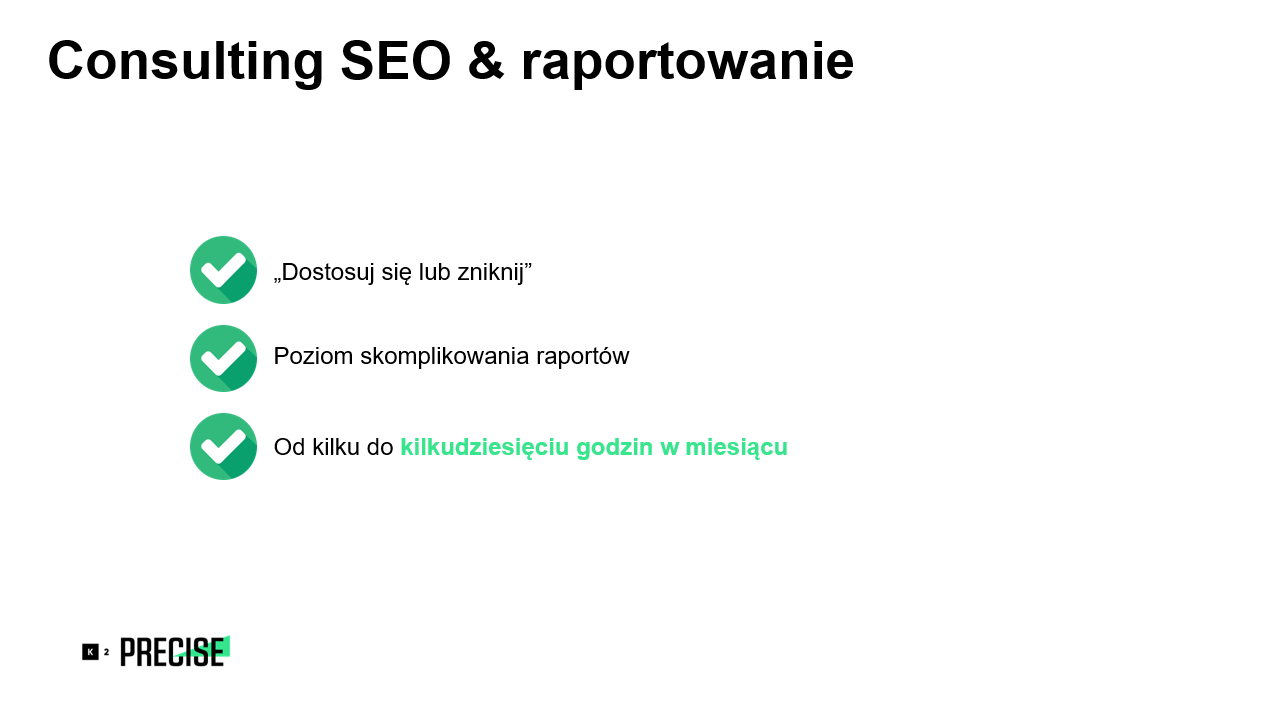 Kolejnym ważnym etapem pracy jest consulting i raportowanie. To etap bardzo istotny z punktu widzenia agencji, a z moich obserwacji wynika, że nie zawsze dostrzegany przez klienta. Google zmienia się praktyczie codziennie i w tym wypadku sprawdza się powiedzenie „dostosuj się lub zniknij”. Obserwowanie i wprowadzanie zmian na bieżąco jest kluczowym elementem powodzenia projektu SEO. O poziomie pracy agencji świadczy poziom skomplikowania raportów. Zadaniem specjalistów jest przekazanie wniosków, a nie tylko danych, które klientowi niezwiązanemu z branżą niczego nie powiedzą. Consulting SEO i raportowanie zajmują agencji od kilku do kilkudziesięciu godzin każdego miesiąca.